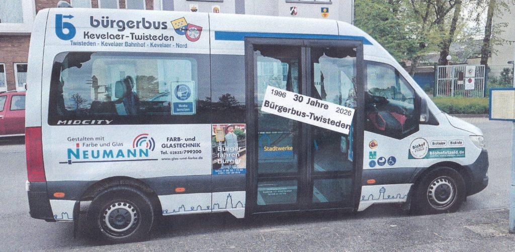 Am 2. Mai 2026 feiert der Bürgerbus Twisteden sein 30jähriges Bestehen. Da feiern wir mit den Fahrerinnen, Fahrern mit Partner und den Ehrenamtlichen Fahrern in Twisteden. Somit fällt am 2. Mai 2026 die letzte Tour, das heißt von 12:30 Uhr bis 13:30 Uhr aus. Wir bitte um Ihr Verständnis. Danke
